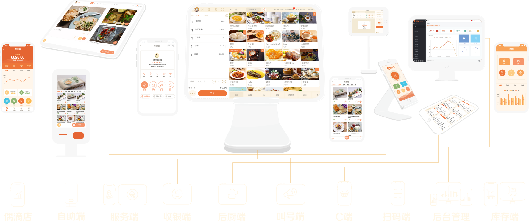收银端 是全能收银机,不但支持支付宝、微信、银行卡,还可查看账单、会员管理以及顾客端和后厨端功能,是餐厅内部的大脑。 详情 |