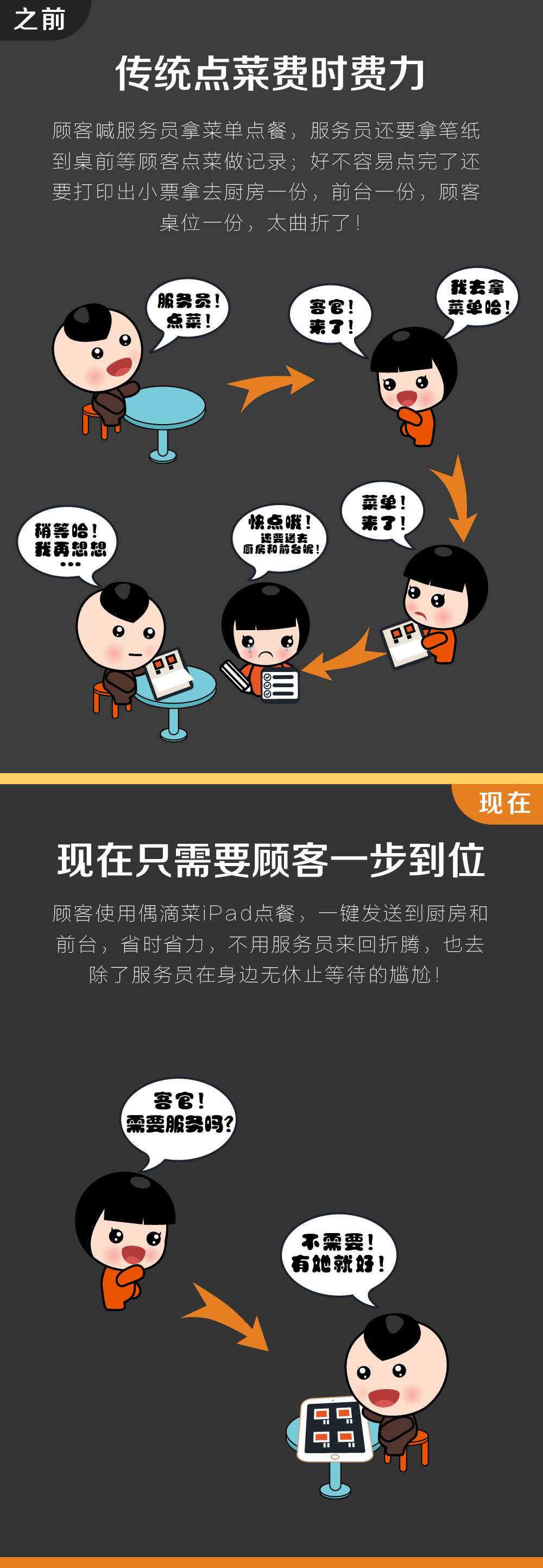 传统菜单和服务员记录单都很浪费纸张,每次换菜单设计费用极高,耗时久,偶滴菜有效解决了这个问题!