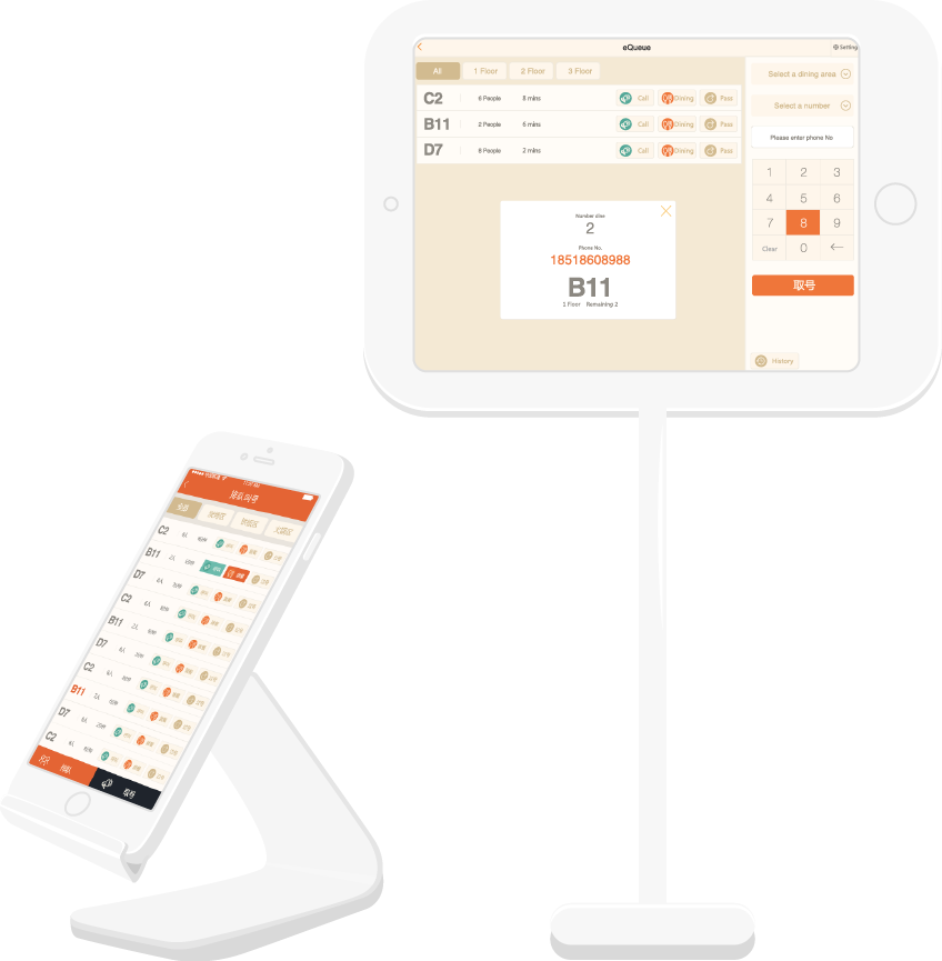 服务员发号,顾客自取小票;等位时间、人数、手机号以及排队号码一应俱全。